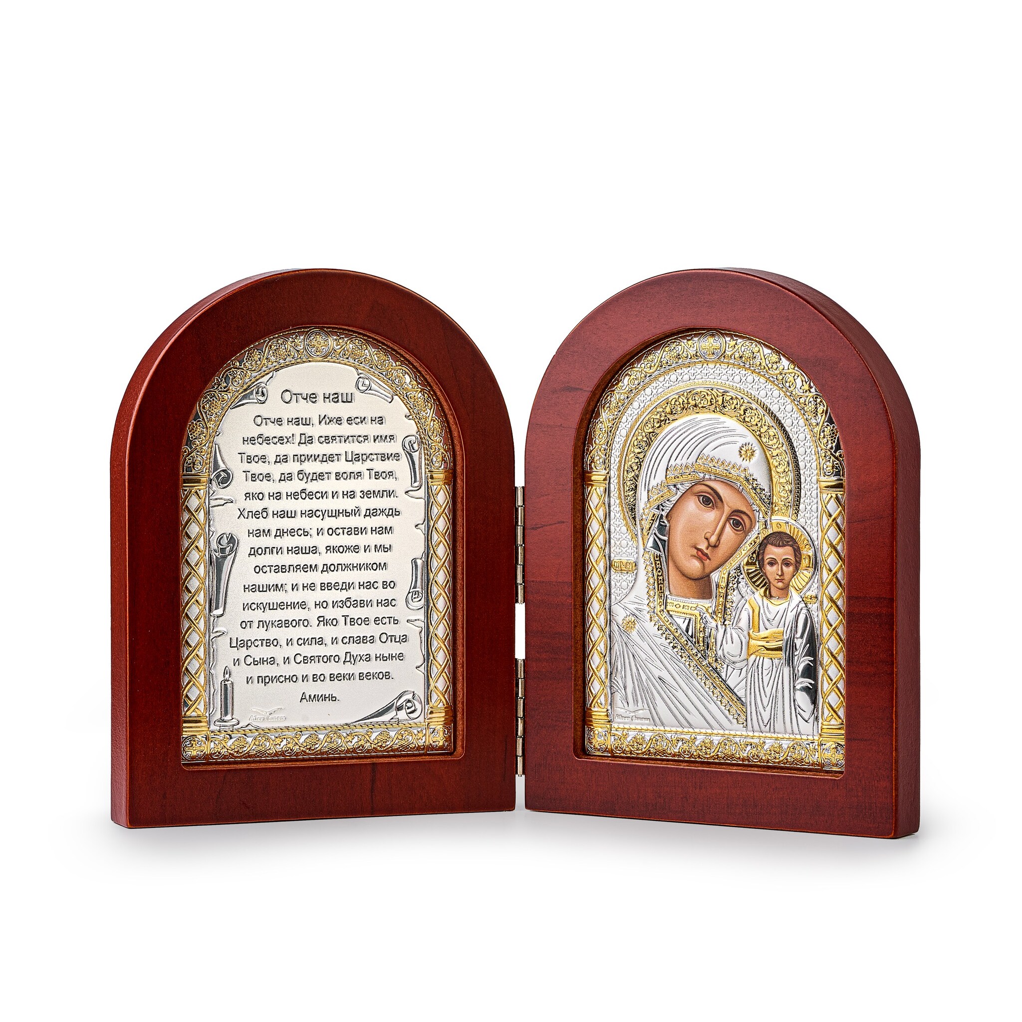 Складень, Казанская БМ, Молитва, икона арочная, красное дерево 140x200мм серебряная Греческая.