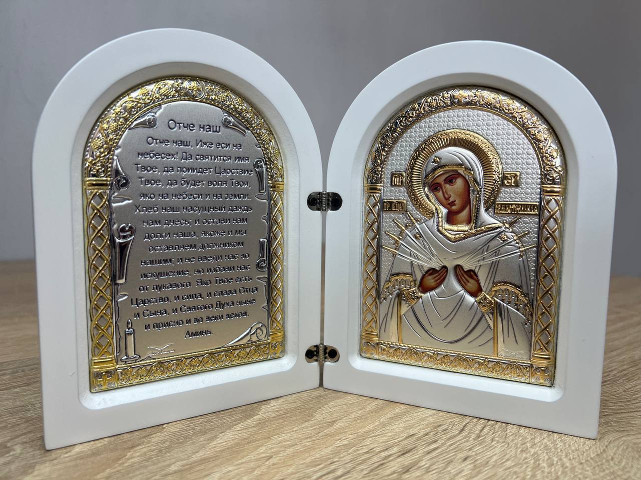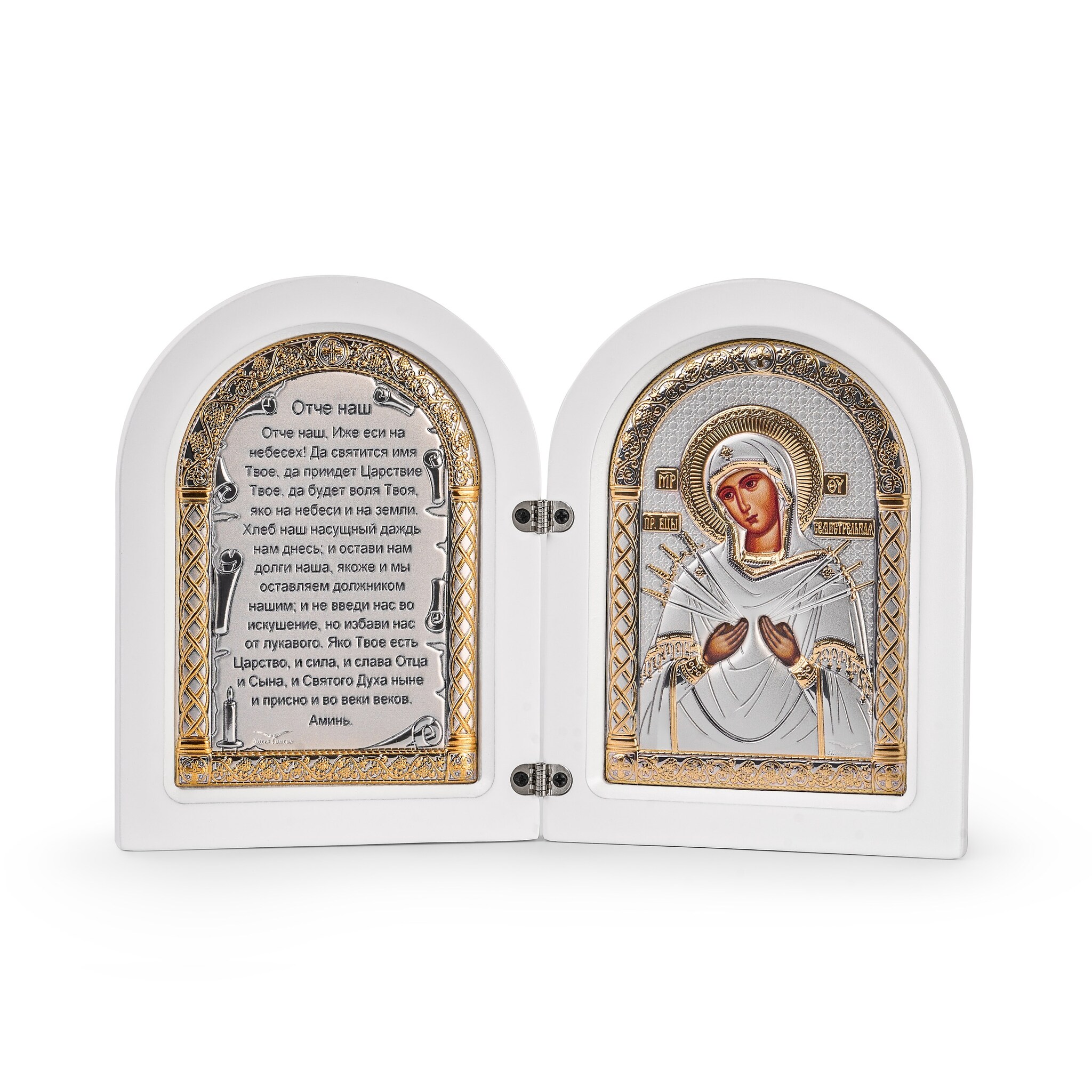 Складень,Семистрельная, Молитва, икона арочная, белое дерево 140x200мм серебряная Греческая.
