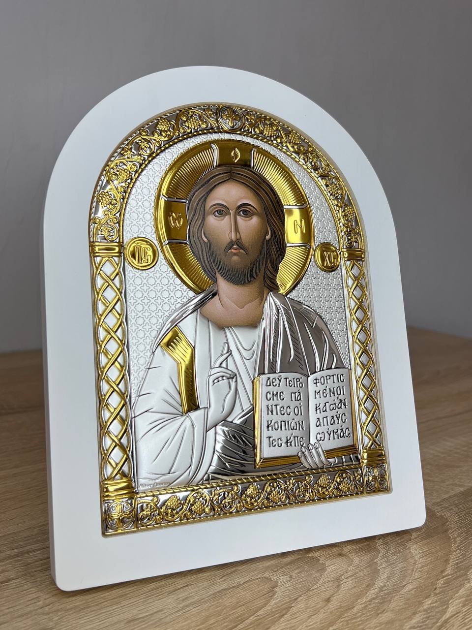 Спаситель, икона арочная, белое дерево 105х140мм серебряная Греческая.
