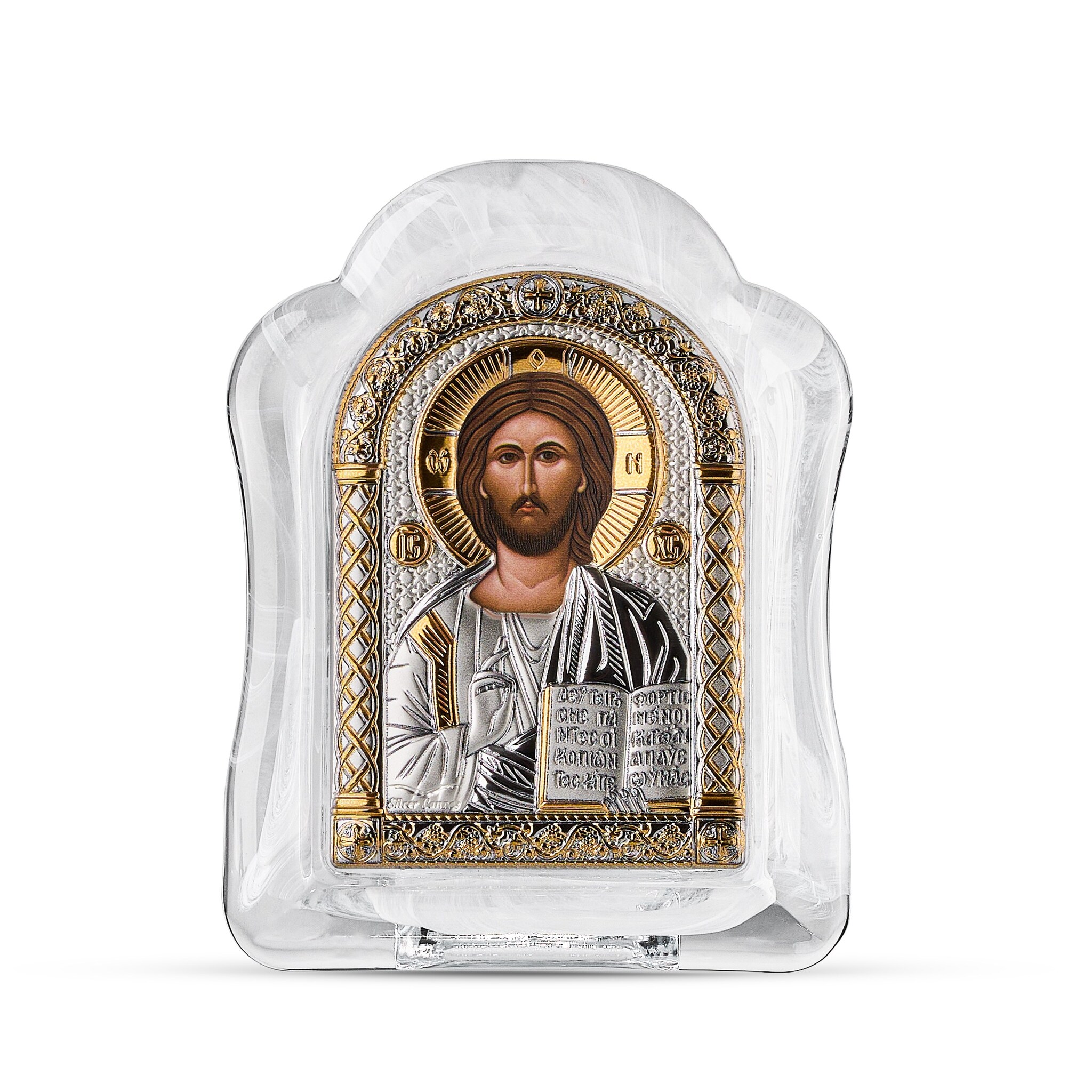Спаситель, икона арочная, белое муранское стекло 65х85мм серебряная Греческая.