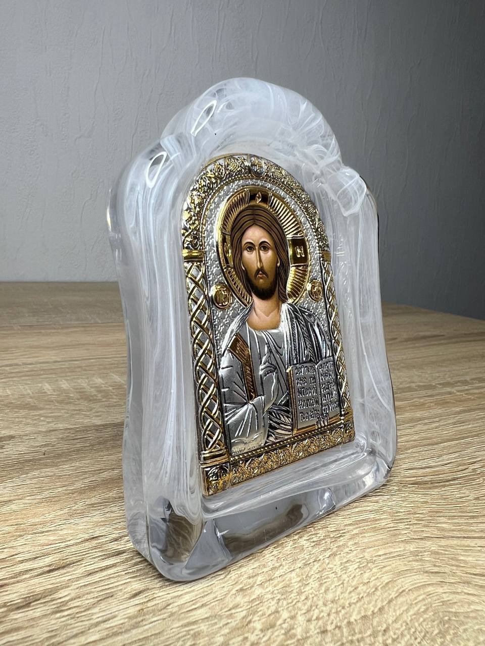 Спаситель, икона арочная, белое муранское стекло 86х112мм серебряная Греческая.