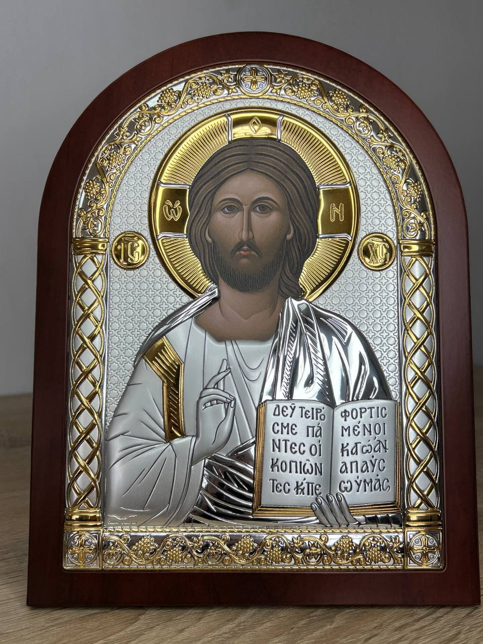Спаситель, икона арочная, красное дерево 175х225мм серебряная Греческая.