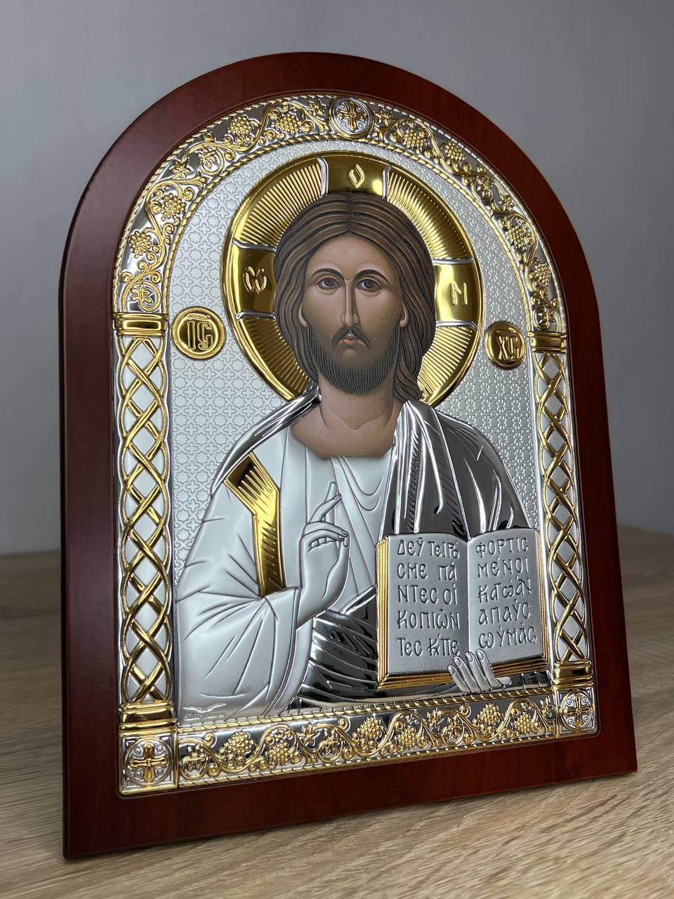 Спаситель, икона арочная, красное дерево 206х275мм серебряная Греческая.