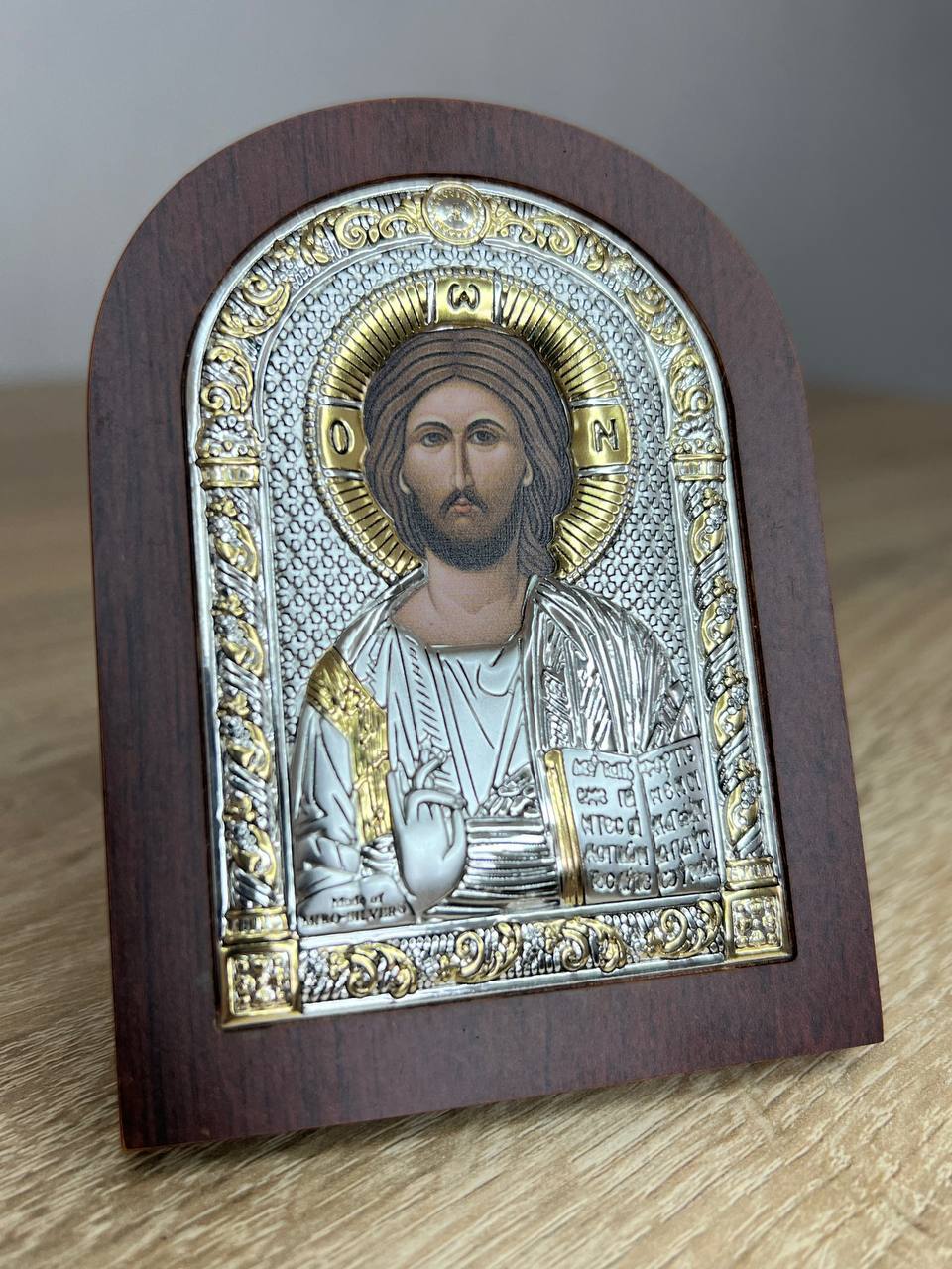 Спаситель, икона арочная, красное дерево 57х75мм серебряная Греческая.
