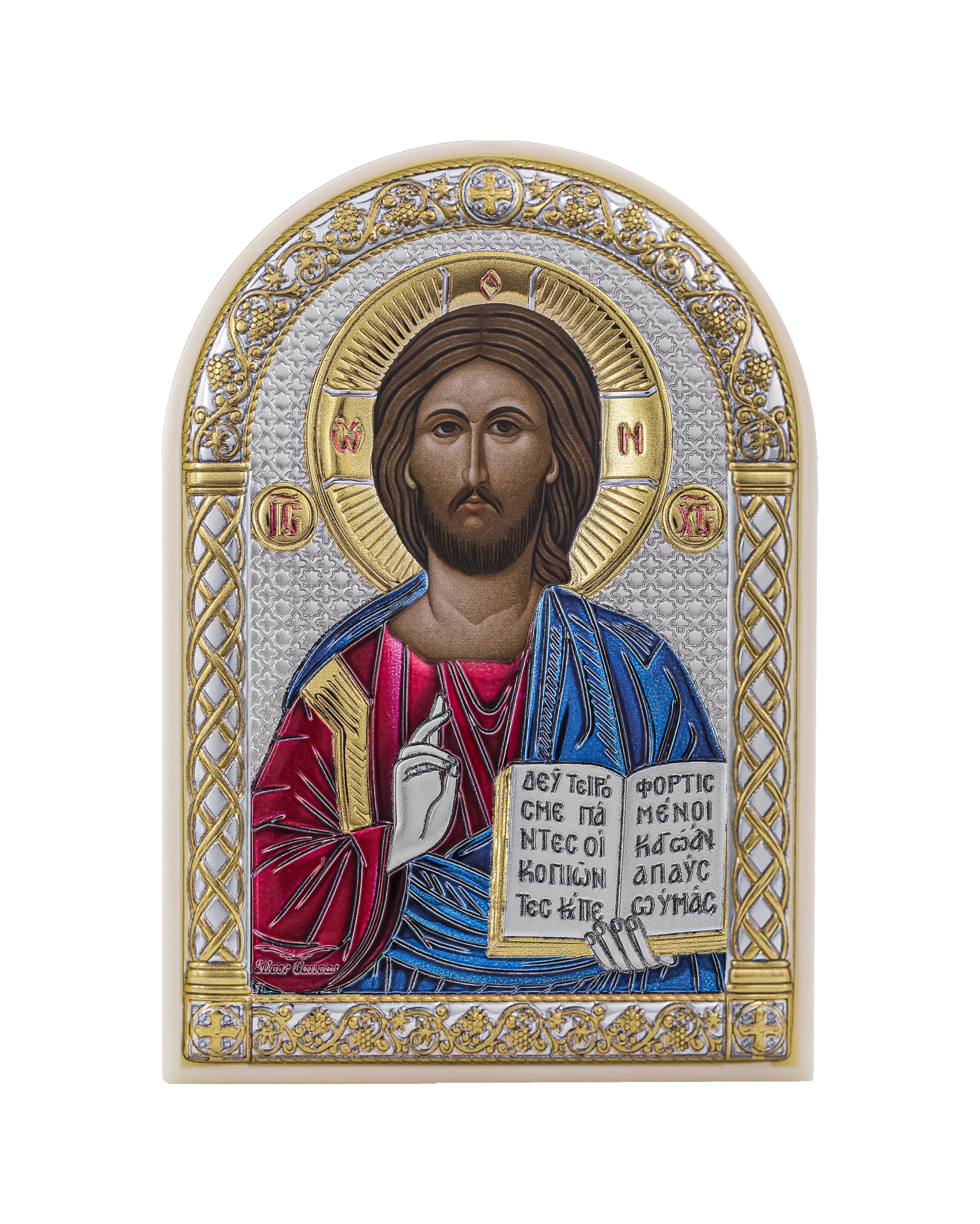 Спаситель, икона арочная, пластик белый, эмаль 48x68мм. серебряная Греческая