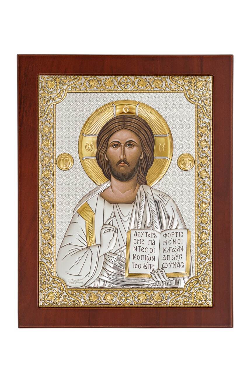 Спаситель, икона прямоугольная с рамкой, красное дерево 185х235мм серебряная Греческая.