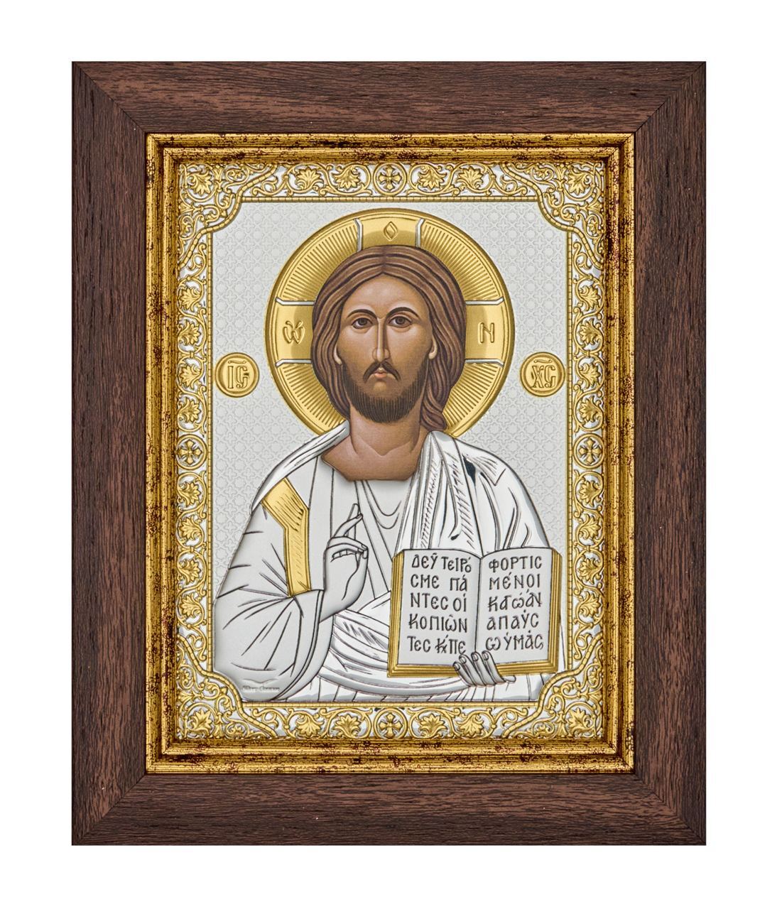 Спаситель, икона прямоугольная в рамке под стеклом, красное дерево 170х210мм серебряная Греческая.