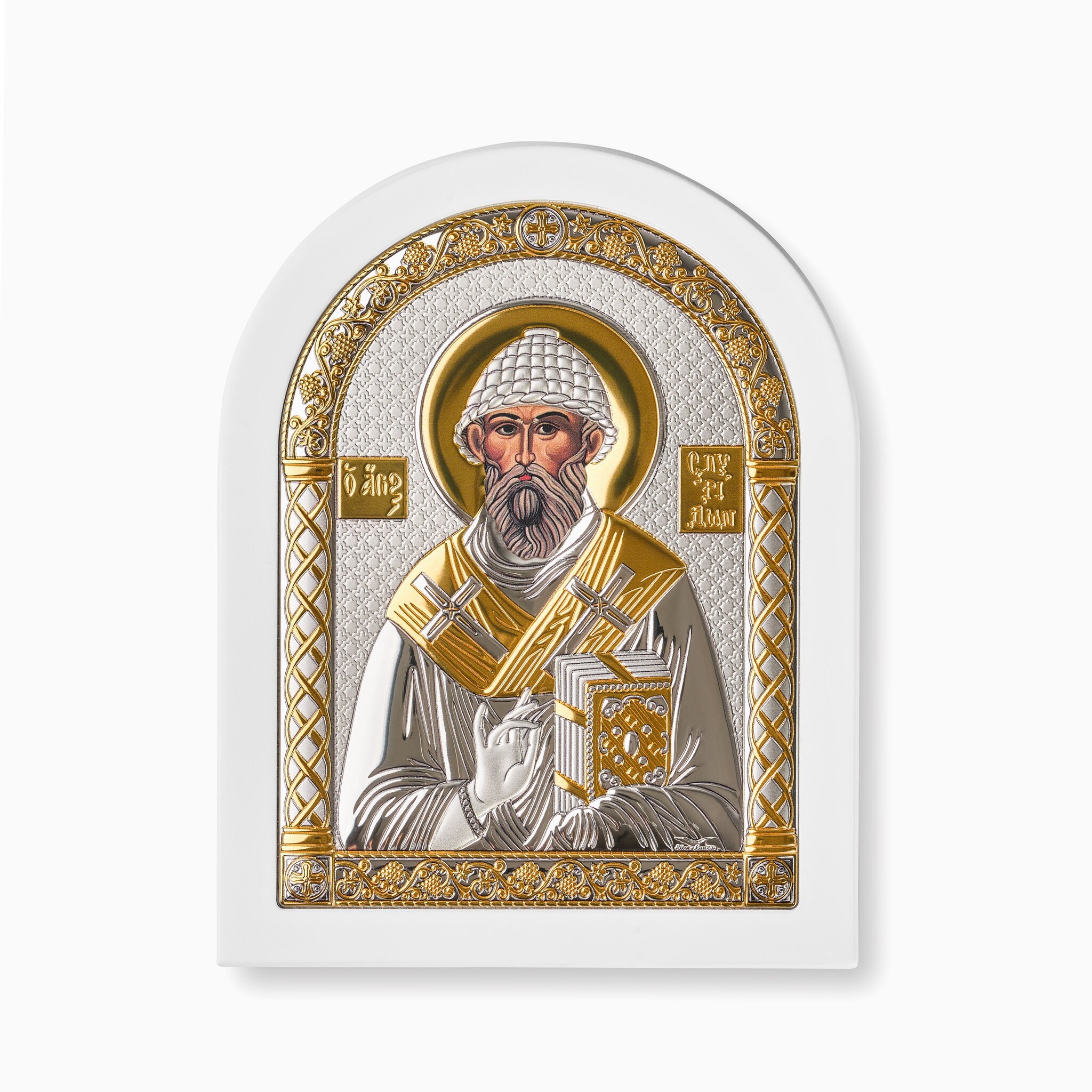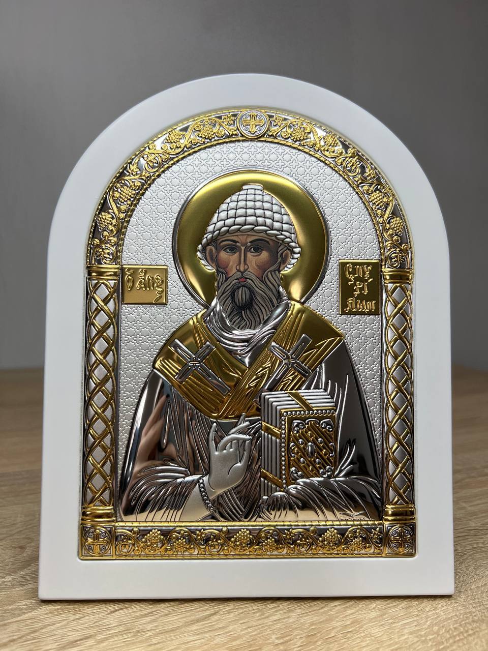 Спиридон, икона арочная, белое дерево 175х225мм серебряная Греческая.