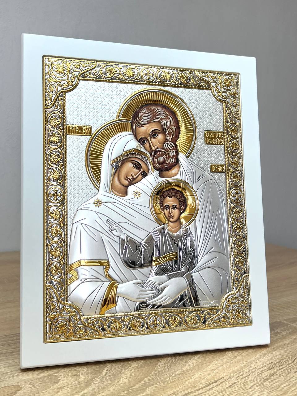 Св. Семейство, икона прямоугольная с рамкой, белое дерево 150х190мм серебряная Греческая.