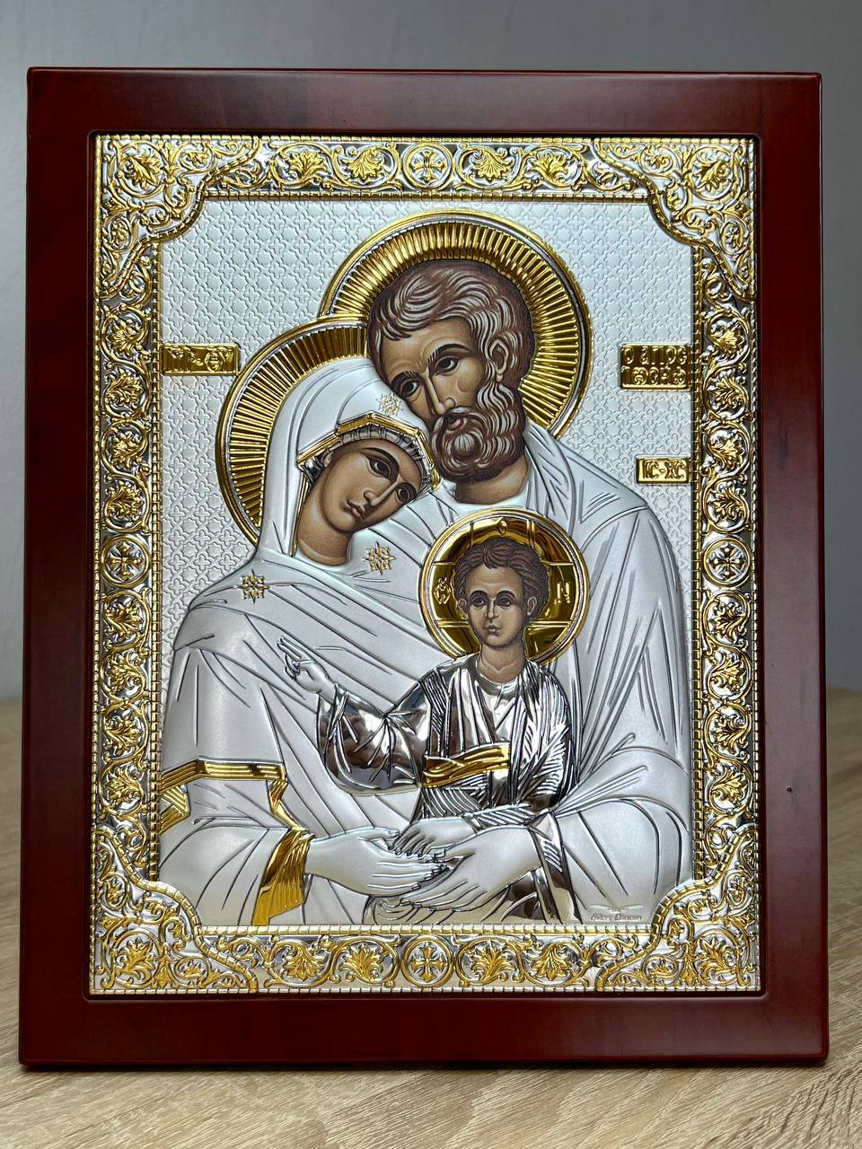 Св. Семейство, икона прямоугольная с рамкой, красное дерево 150х190мм серебряная Греческая.