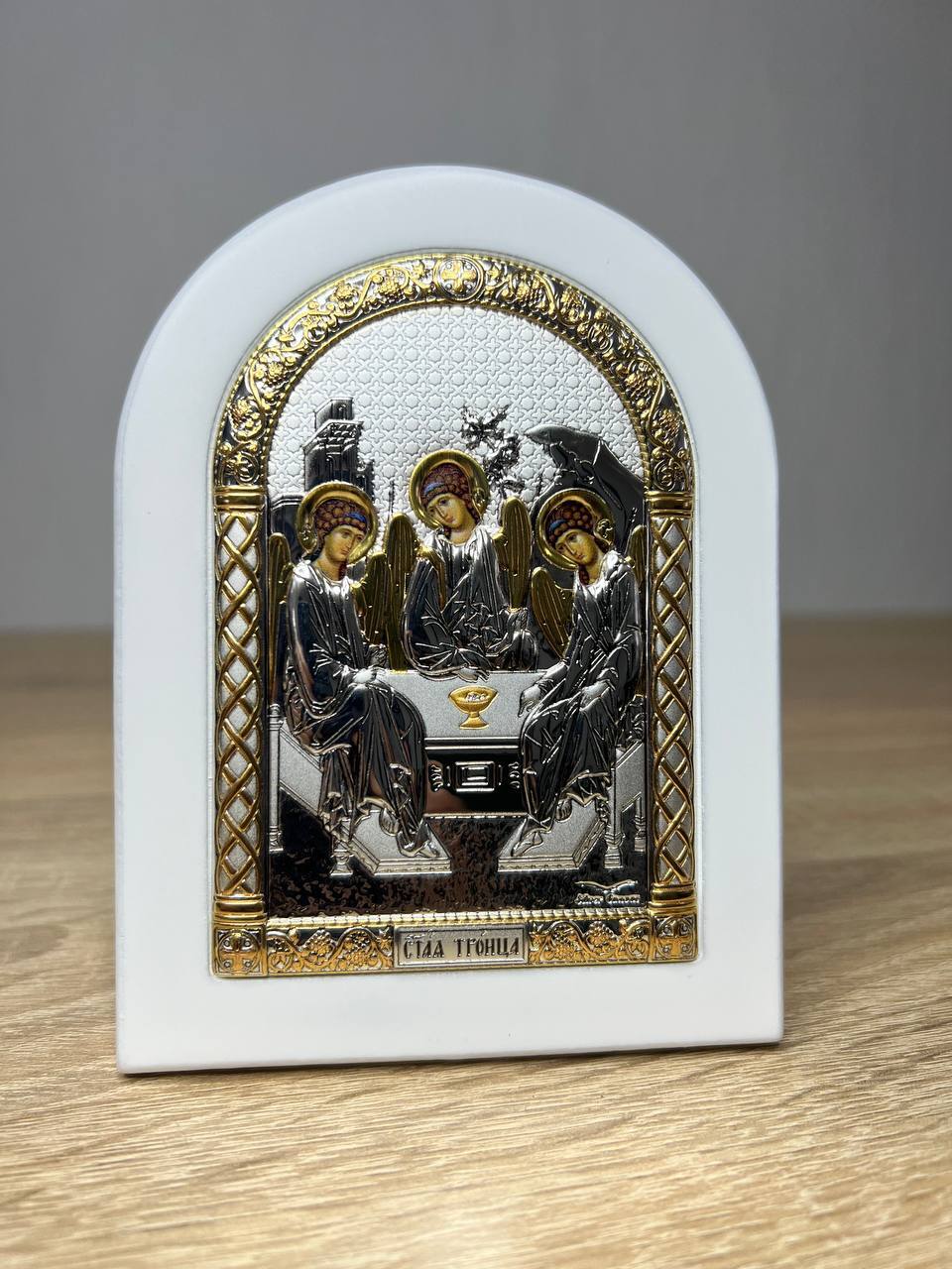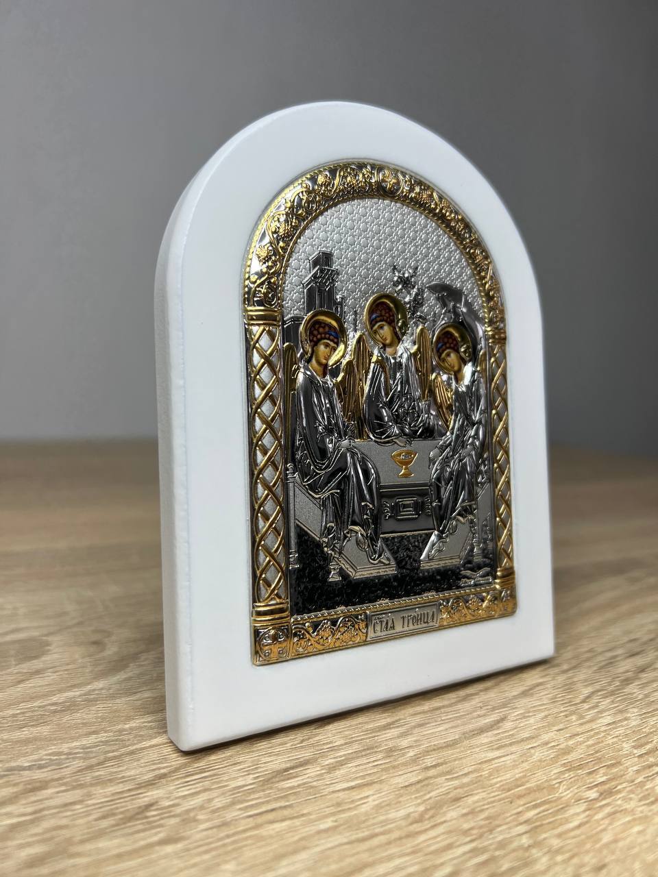 Св. Троица, икона арочная, белое дерево 105х140мм серебряная Греческая.