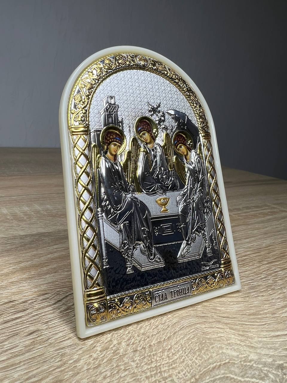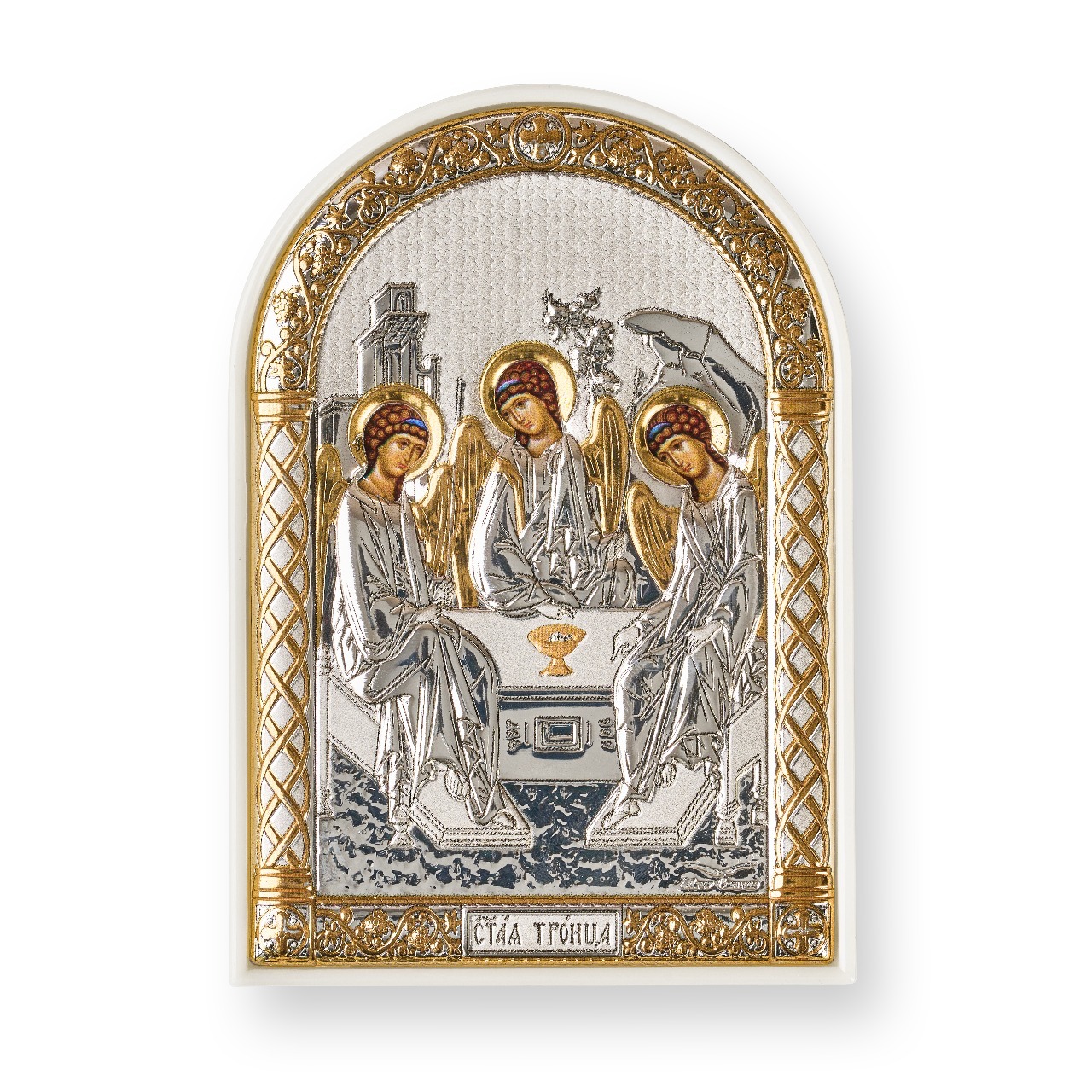 Св. Троица, икона арочная, пластик белый, 80х115мм серебряная греческая