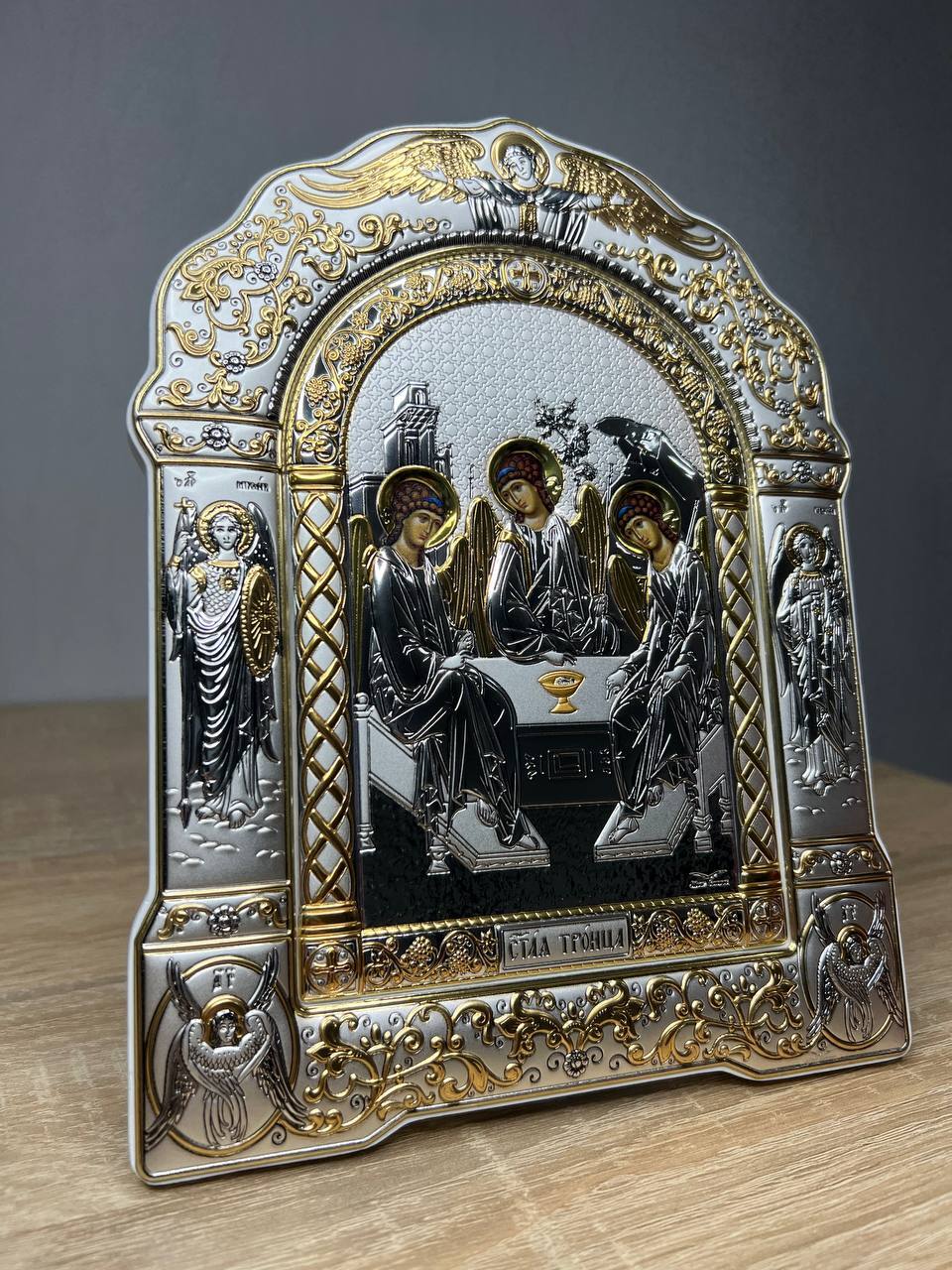 Св. Троица, икона арочная с рамкой, белое дерево 206х270мм серебряная Греческая.