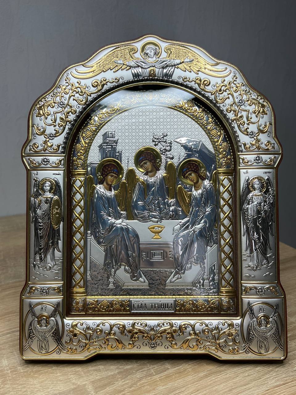 Св. Троица, икона арочная с рамкой под стеклом, красное дерево 206х270мм серебряная Греческая.