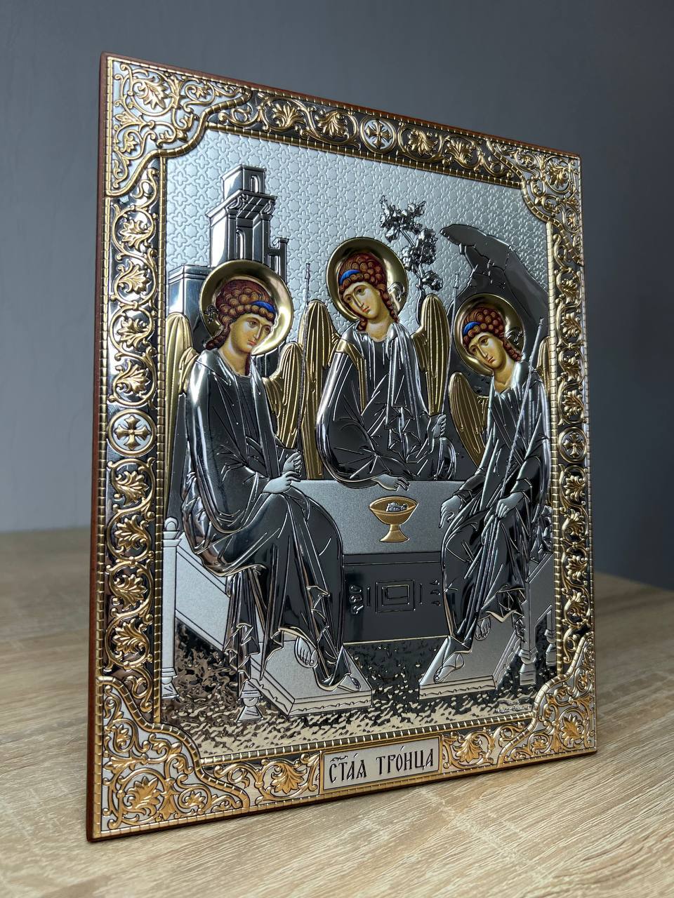 Св. Троица, икона прямоугольная без рамки, красное дерево 150х200мм серебряная Греческая.
