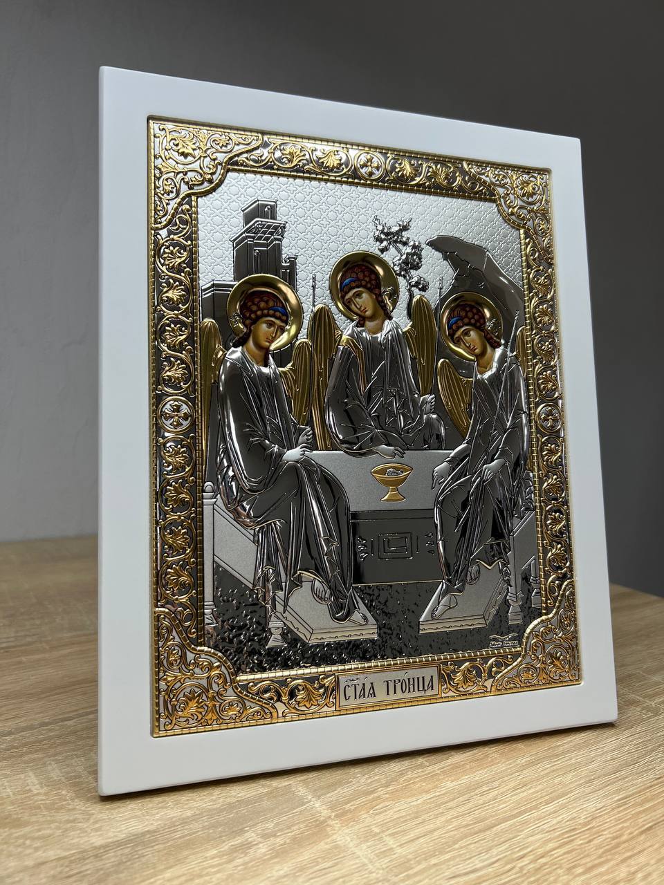 Св. Троица, икона прямоугольная с рамкой, белое дерево 150х190мм серебряная Греческая.