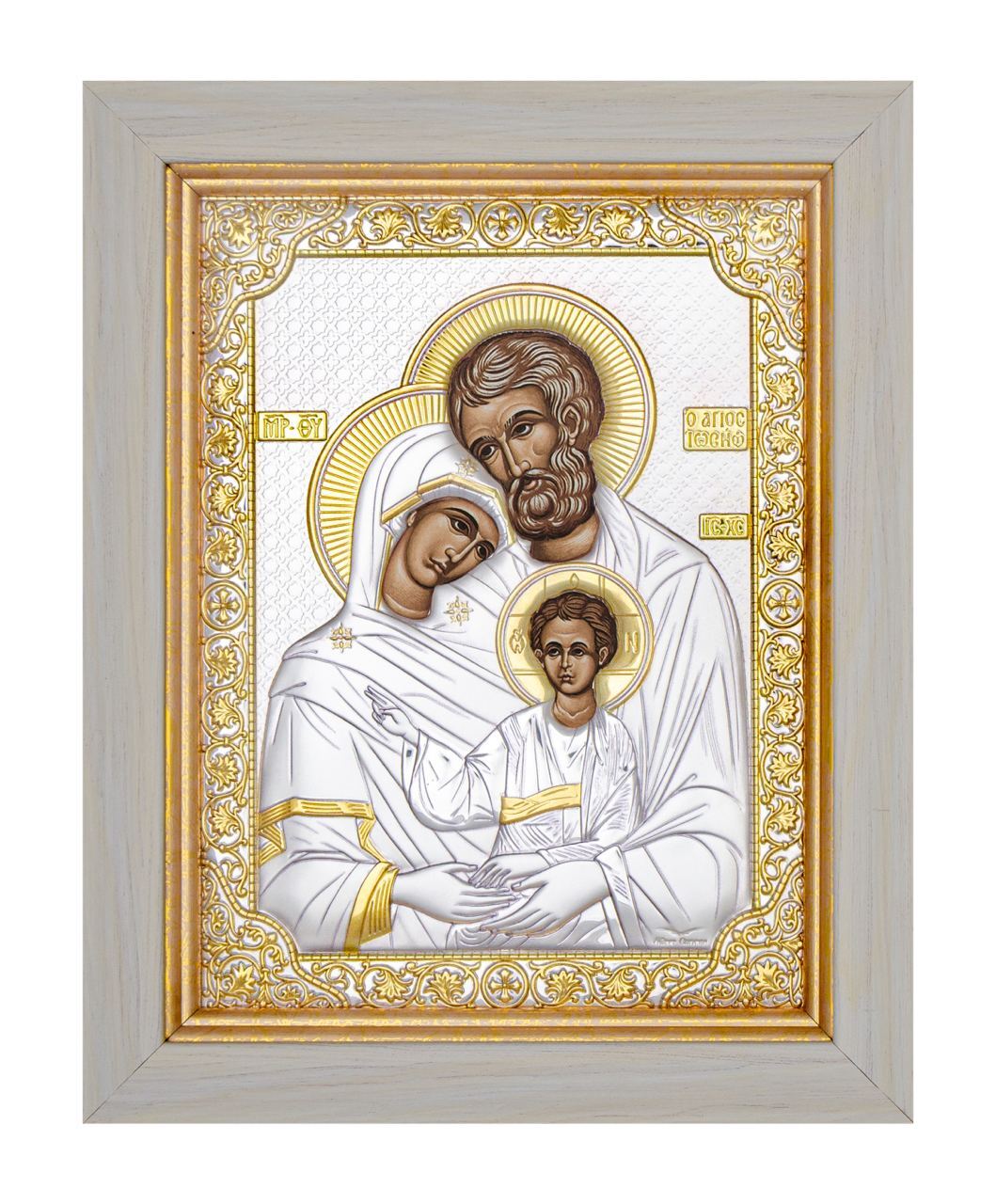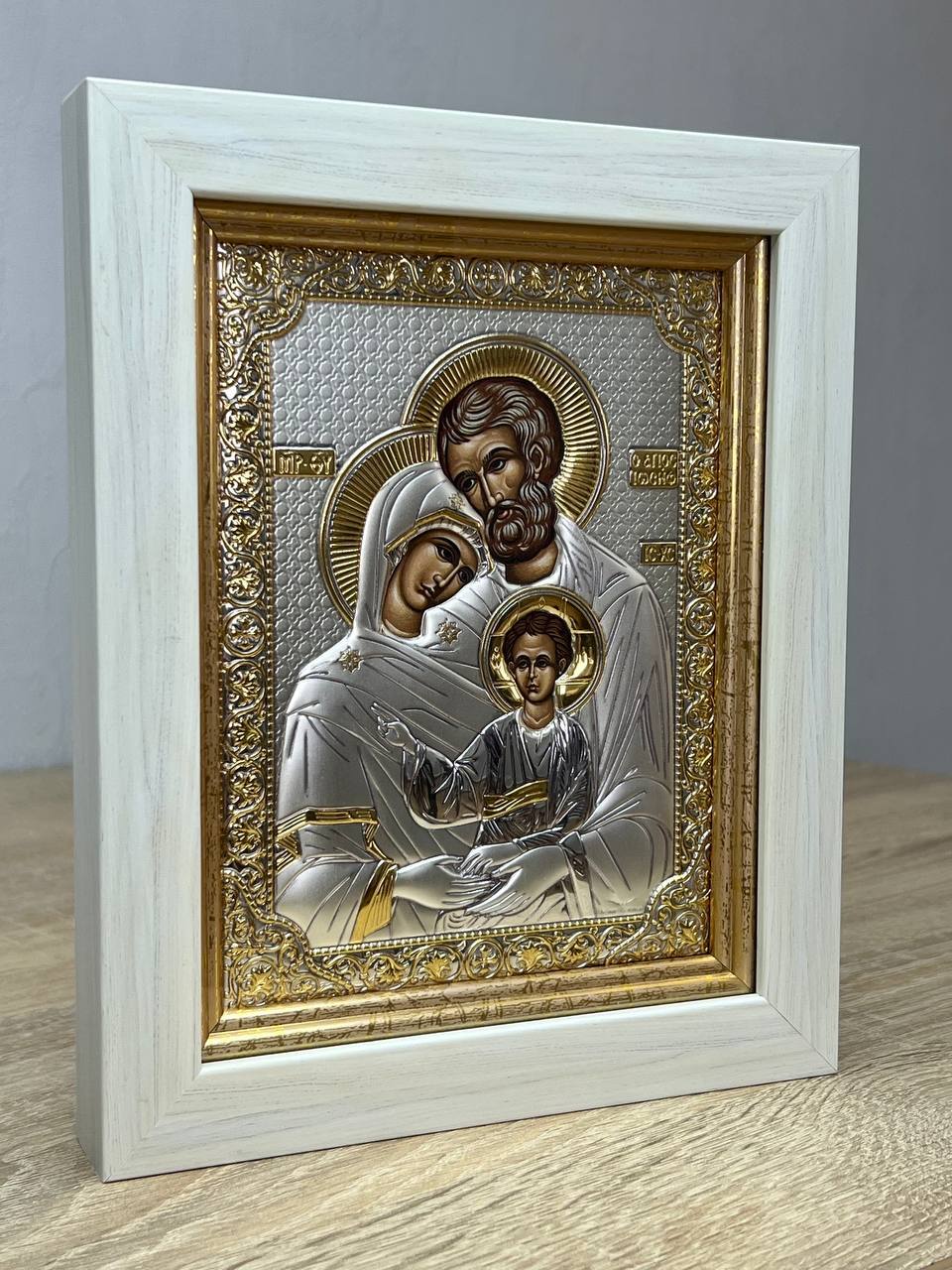 Святое Семейство, икона прямоугольная в рамке под стеклом, белое дерево, 232х280 серебряная Греческая.