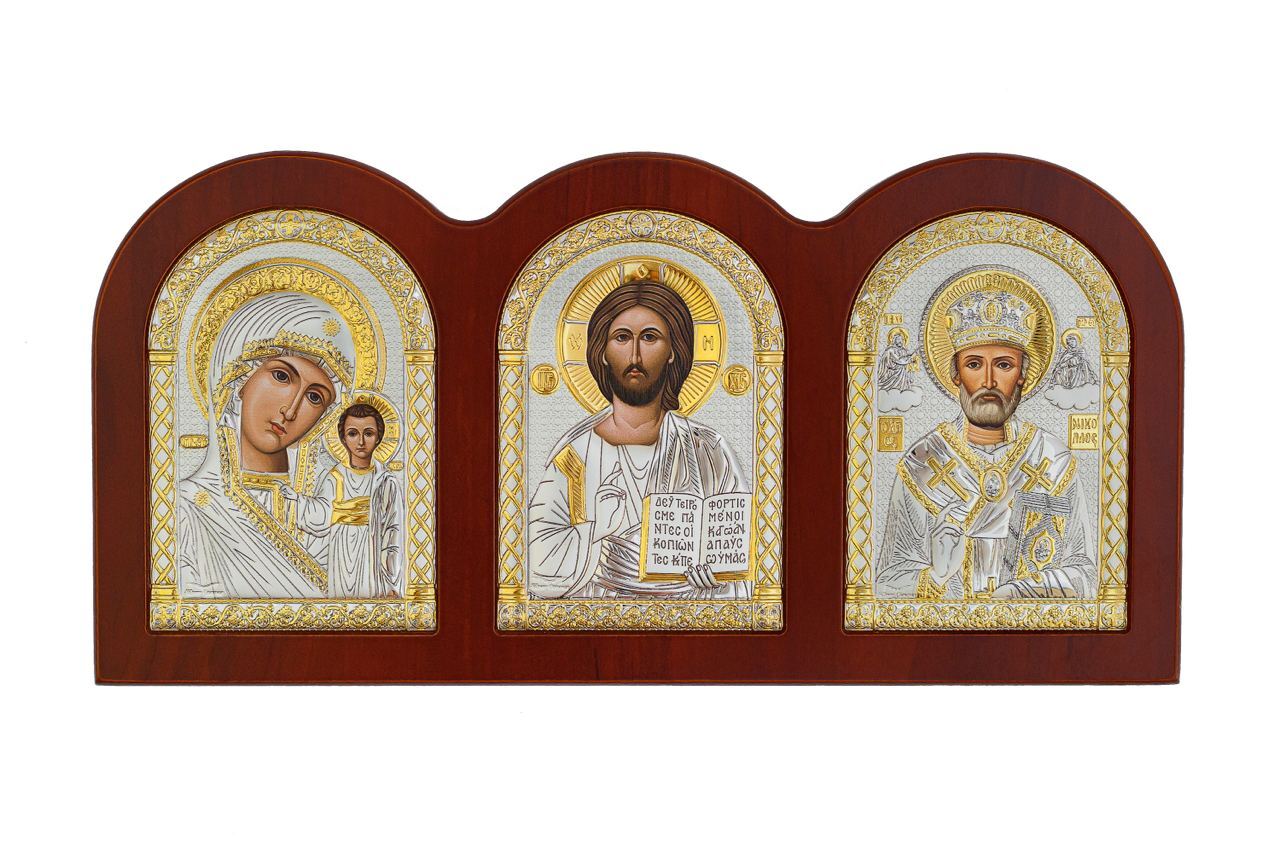 Триптих, Спаситель, Казанская БМ, Николай Чудотворец, икона, красное дерево 75х160мм серебряная Греческая.