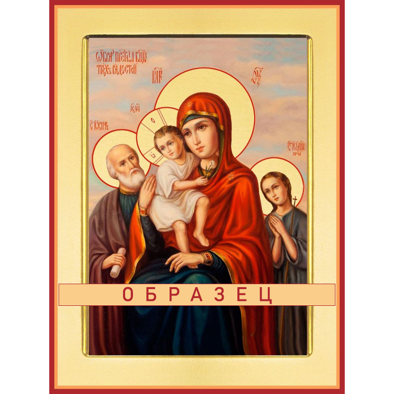 После усердной молитвы перед этой иконой несчастная женщина получила сразу три радостных известия: оклеветанный злыми людьми муж был оправдан и возвращён из ссылки; сын, попавший в плен во время военных действий, освобождён, а конфискованное по неправому суду имение возвращено семье. С тех пор образ стал называться «Трёх радостей».