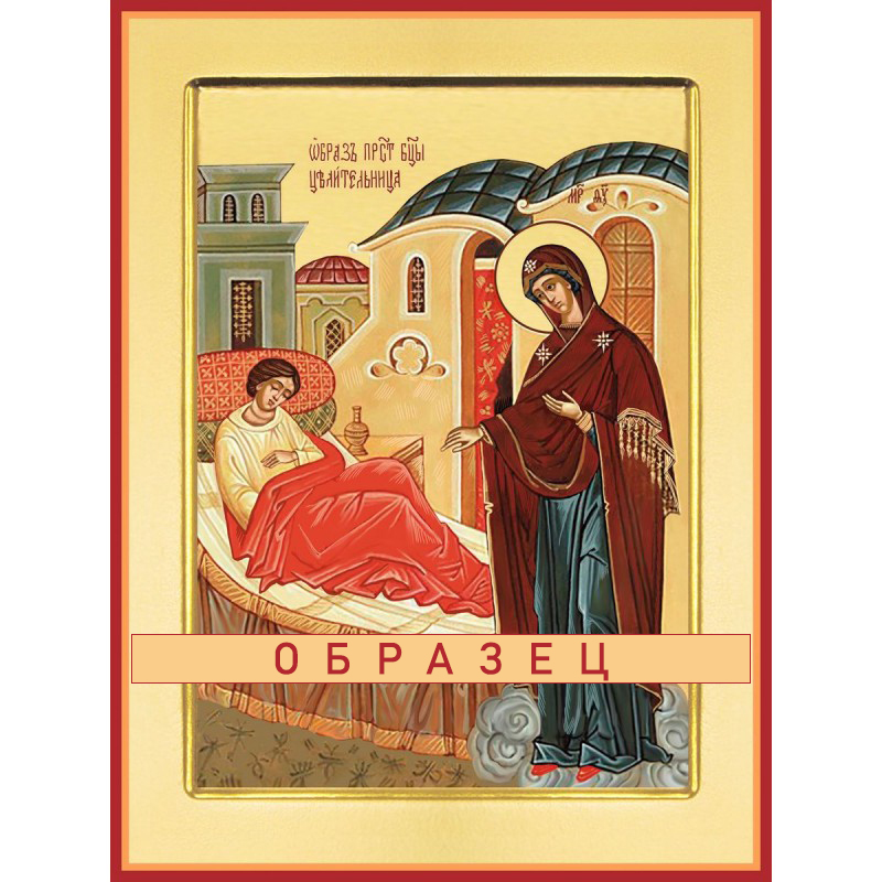 На иконе Целительница Пресвятая Богородица изображена стоящей во весь рост у постели больного клирика, к которому явилась Сама Матерь Божия в ответ на горячую молитву и послала знамение Своей неизреченной любви и милости: больной получил совершенное исцеление, тотчас же пошел в церковь и, встав на клирос вместе с поющими, привел в изумление всех окружающих.