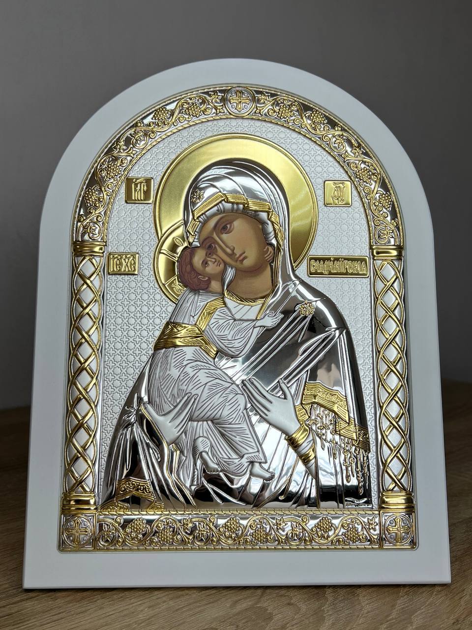 Владимирская БМ, икона арочная, белое дерево 175х225мм серебряная Греческая.