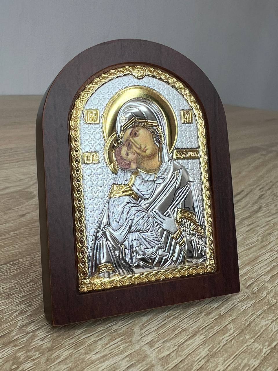 Владимирская БМ, икона арочная, красное дерево 60х75мм серебряная Греческая.