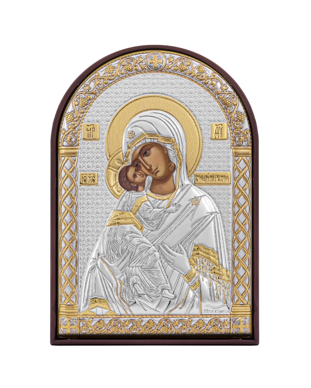 Владимирская БМ, икона арочная, пластик коричневый 48x71мм серебряная Греческая