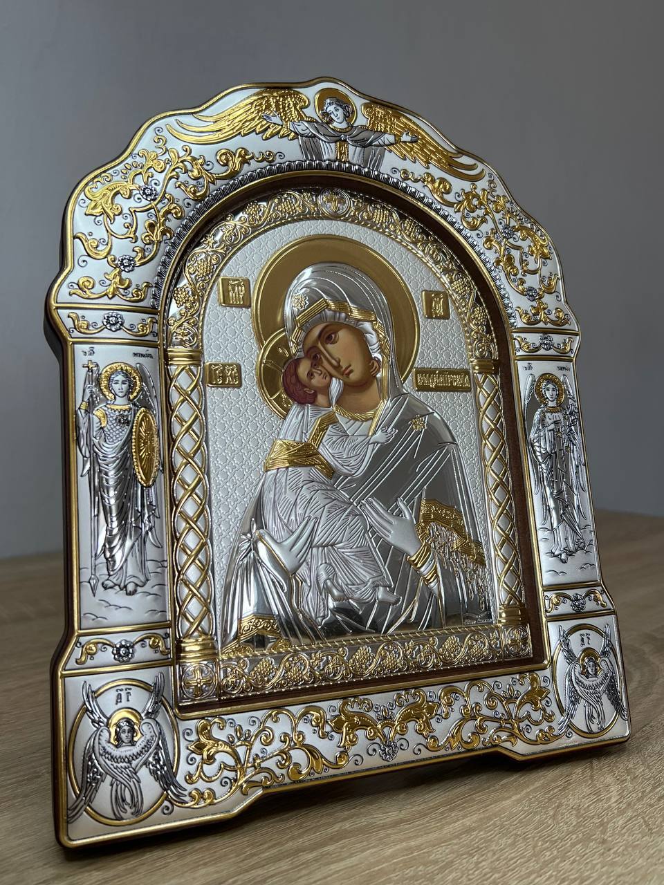 Владимирская БМ, икона арочная с рамкой под стеклом, красное дерево 206х270мм серебряная Греческая.