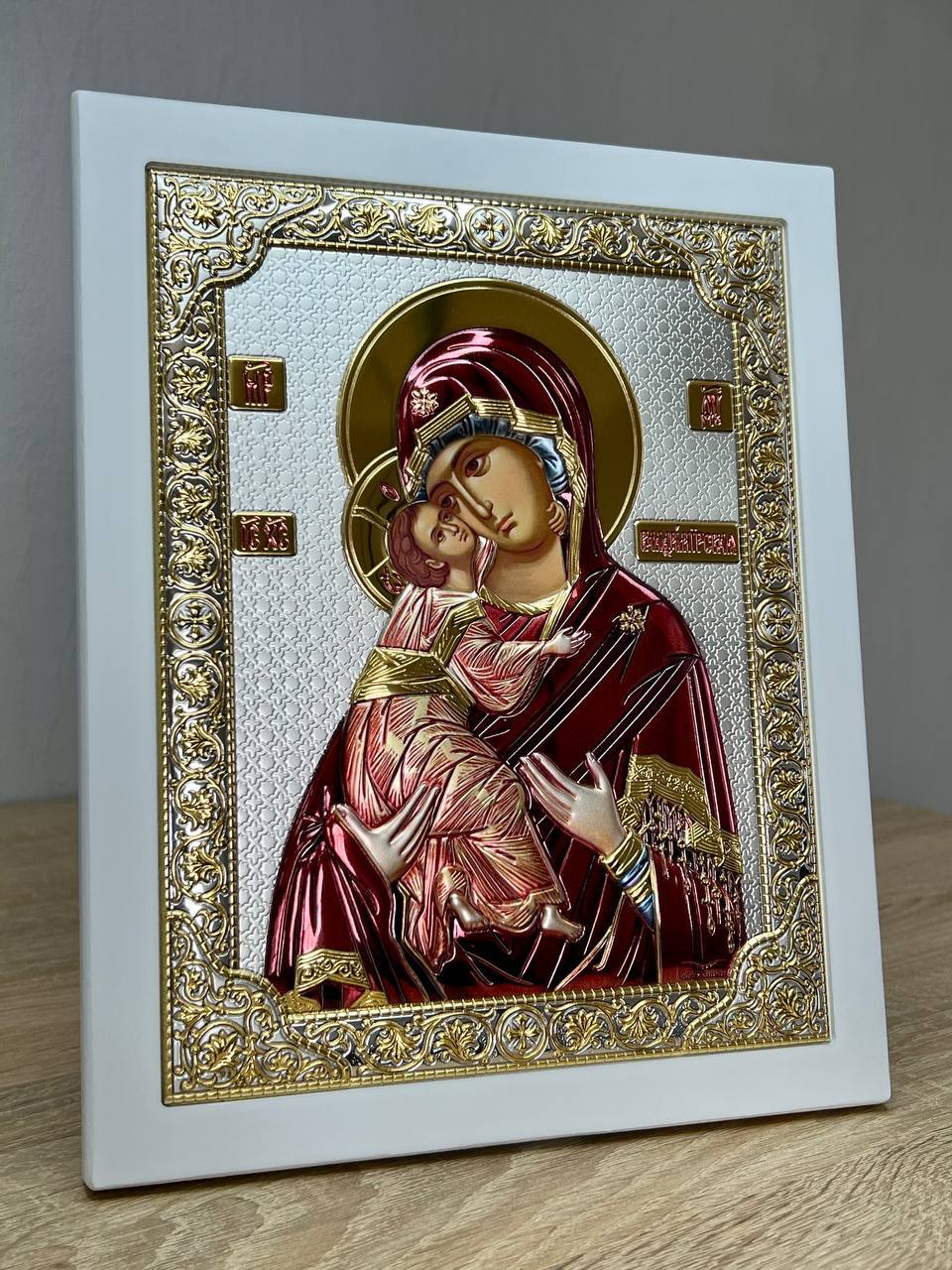 Владимирская БМ, икона прямоугольная с рамкой, белое дерево, эмаль 185х235мм серебряная Греческая.