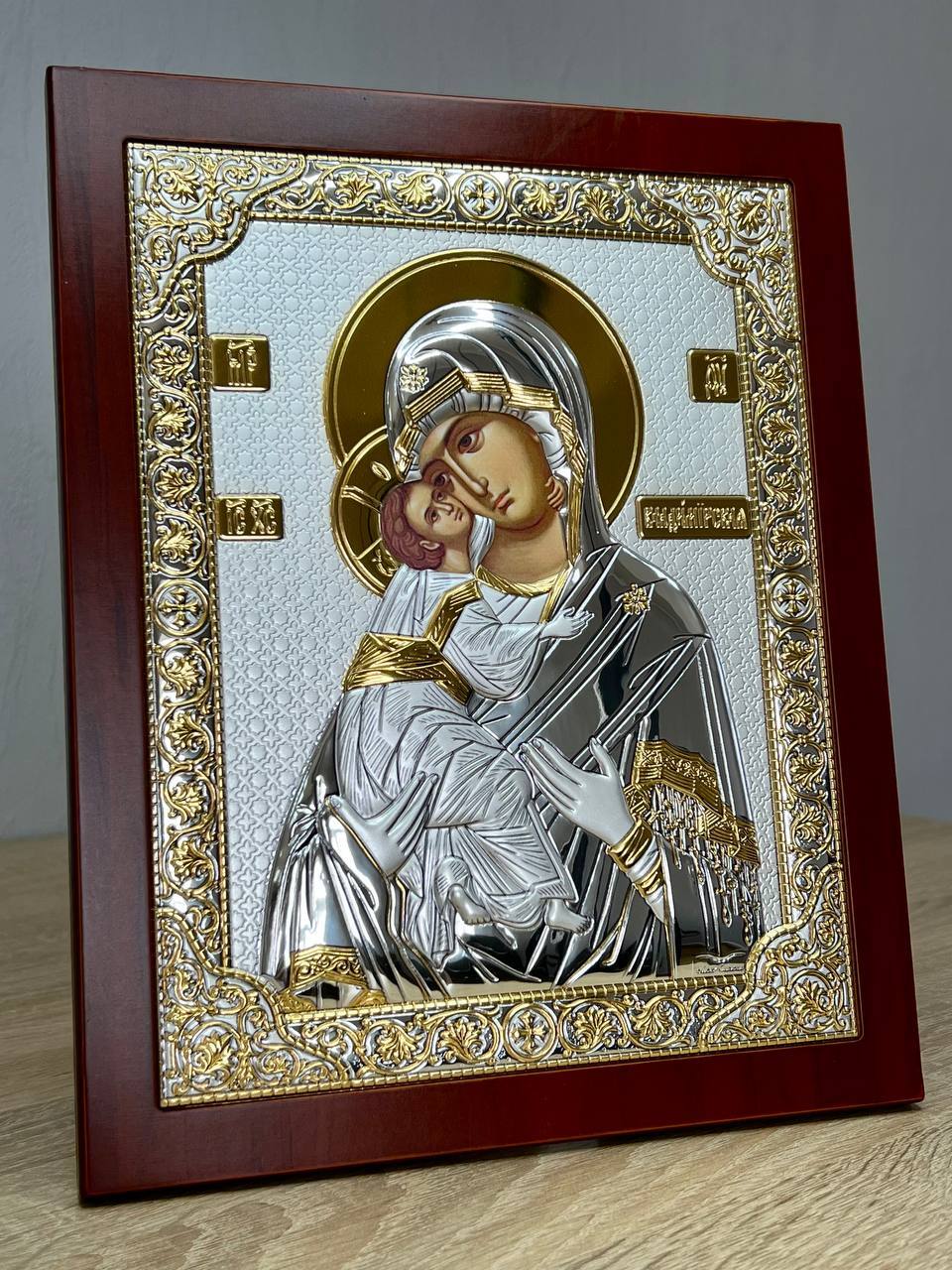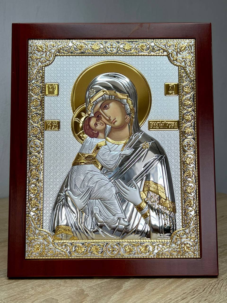 Владимирская БМ, икона прямоугольная с рамкой, красное дерево 185х235мм серебряная Греческая.