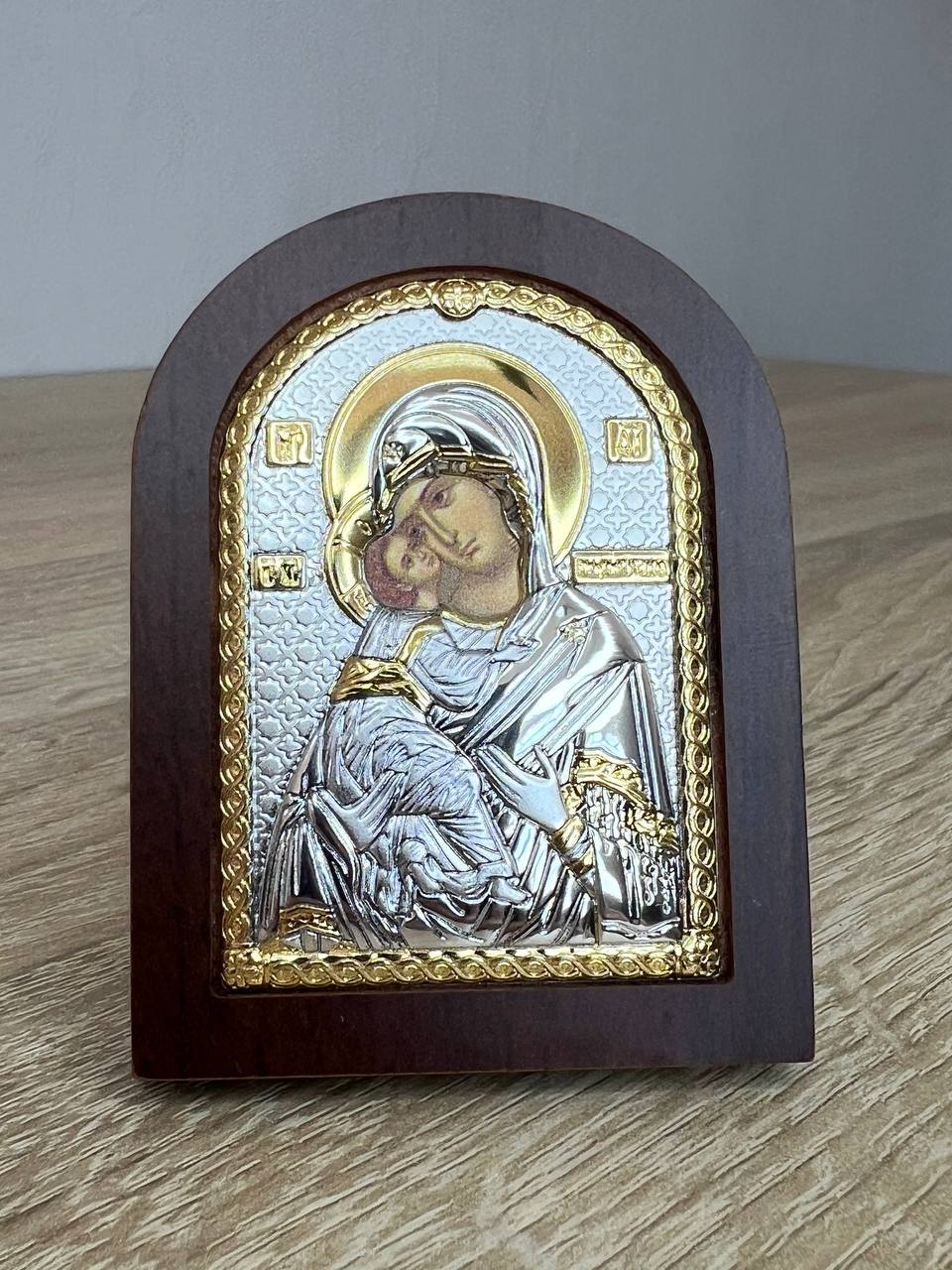 Владимиская БМ, икона арочная, красное дерево, 86х112мм серебряная Греческая.