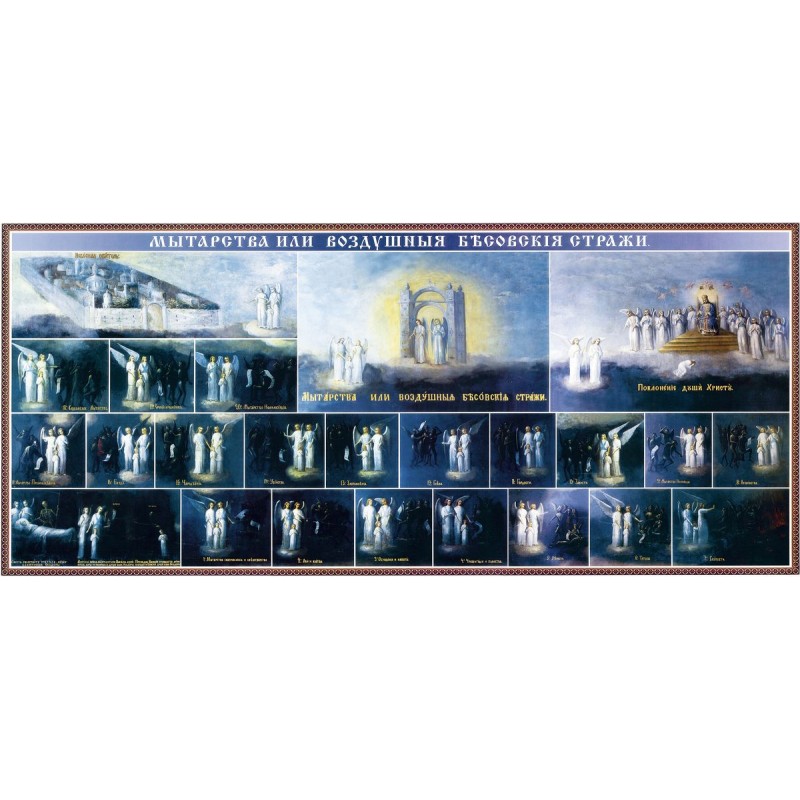 Для истязания душ, проходящих воздушное пространство, установлены темными властями отдельные судилища и стражи в замечательном порядке. По слоям поднебесной, от земли до самого неба, стоят сторожевые полки падших духов. Каждое отделение заведывает особенным видом греха и истязывает в нем душу, когда душа достигнет этого отделения. Воздушные бесовские стражи и судилища называются в отеческих писаниях мытарствами, а духи, служащие в них, – мытарями’’.